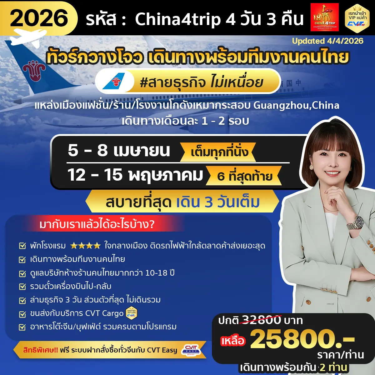 China4trip ทุกกรุ๊ปที่เดินทางกับเรา เรามีล่ามธุรกิจมืออาชีพ (ไม่ใช่ไกด์นักศึกษาแปลภาษาทั่วไป) เรามีล่ามธุรกิจ ที่มีประสบการณ์มากกว่า 8-20 ปี พาดีลธุรกิจ-เดินตลาดประกบทุกกรุ๊ป เช่น เดินทาง 2-3 ท่าน มีล่าม 1 คน ดูแลนักธุรกิจ พ่อค้า แม่ค้าคนไทย คนลาว คนเวียดนาม คนมาเลย์ และต่างชาติ รวมถึงนักธุรกิจไทยในเกาหลี ยุโรป อเมริกา ออสเตรเลีย เพื่อช่วยในการสื่อสาร เจรจาต่อรอง และทำความเข้าใจข้อมูลสินค้า นอกจากนี้ยังให้คำปรึกษาและวางแผนเส้นทางการเดินทาง เช่น แนะนำแหล่งที่เหมาะสมกับความต้องการของลูกค้า และวางแผนเส้นทางเดินตลาด/เยี่ยมชมโรงงาน เพื่อให้การเดินทางมีประสิทธิภาพสูงสุด และดูแลตลอดทริปครอบคลุมตั้งแต่การจัดการเรื่องวีซ่าจีน, ตั๋วเครื่องบิน, ที่พัก และการเดินทางภายในประเทศจีน